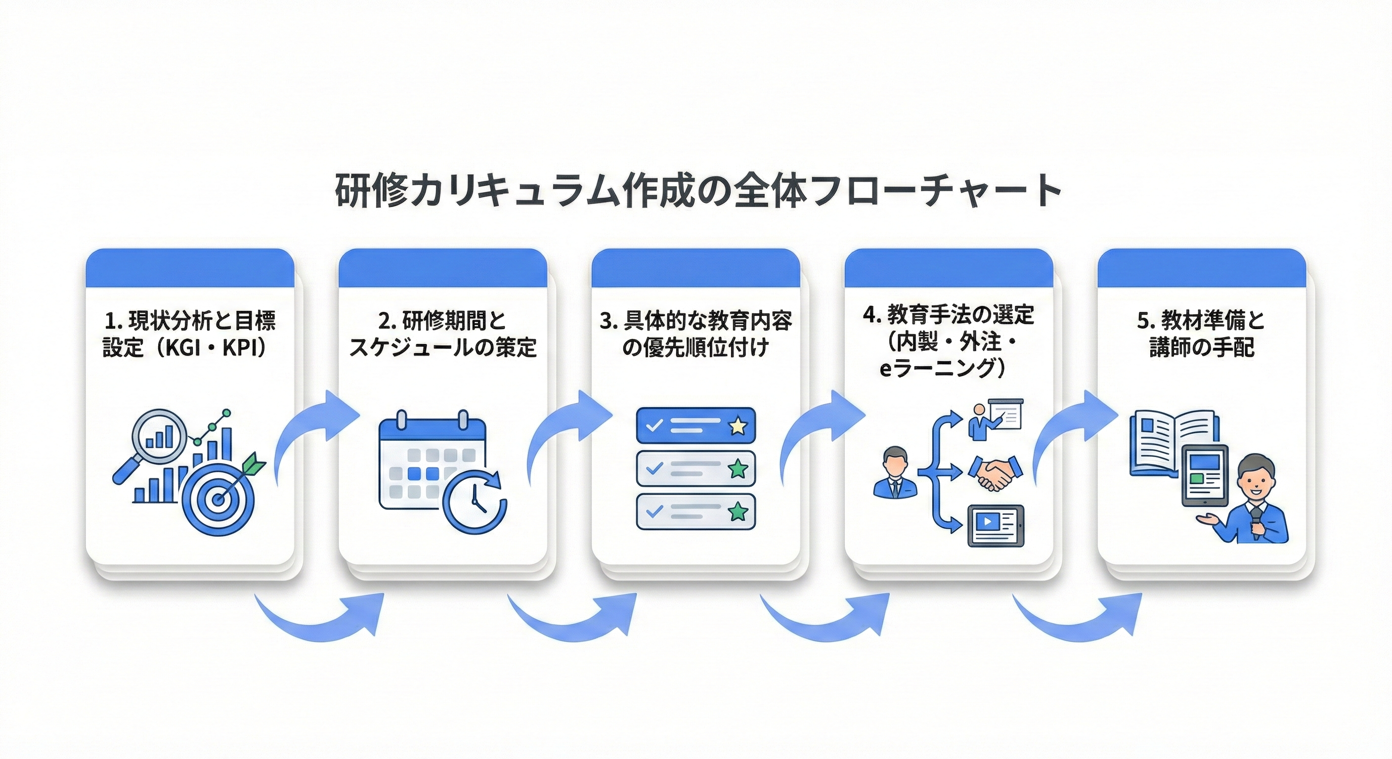 いきなりスケジュール表を埋め始めるのではなく、以下のステップ順に進めることで、抜け漏れがなく、説得力のある研修計画を立てることができます。