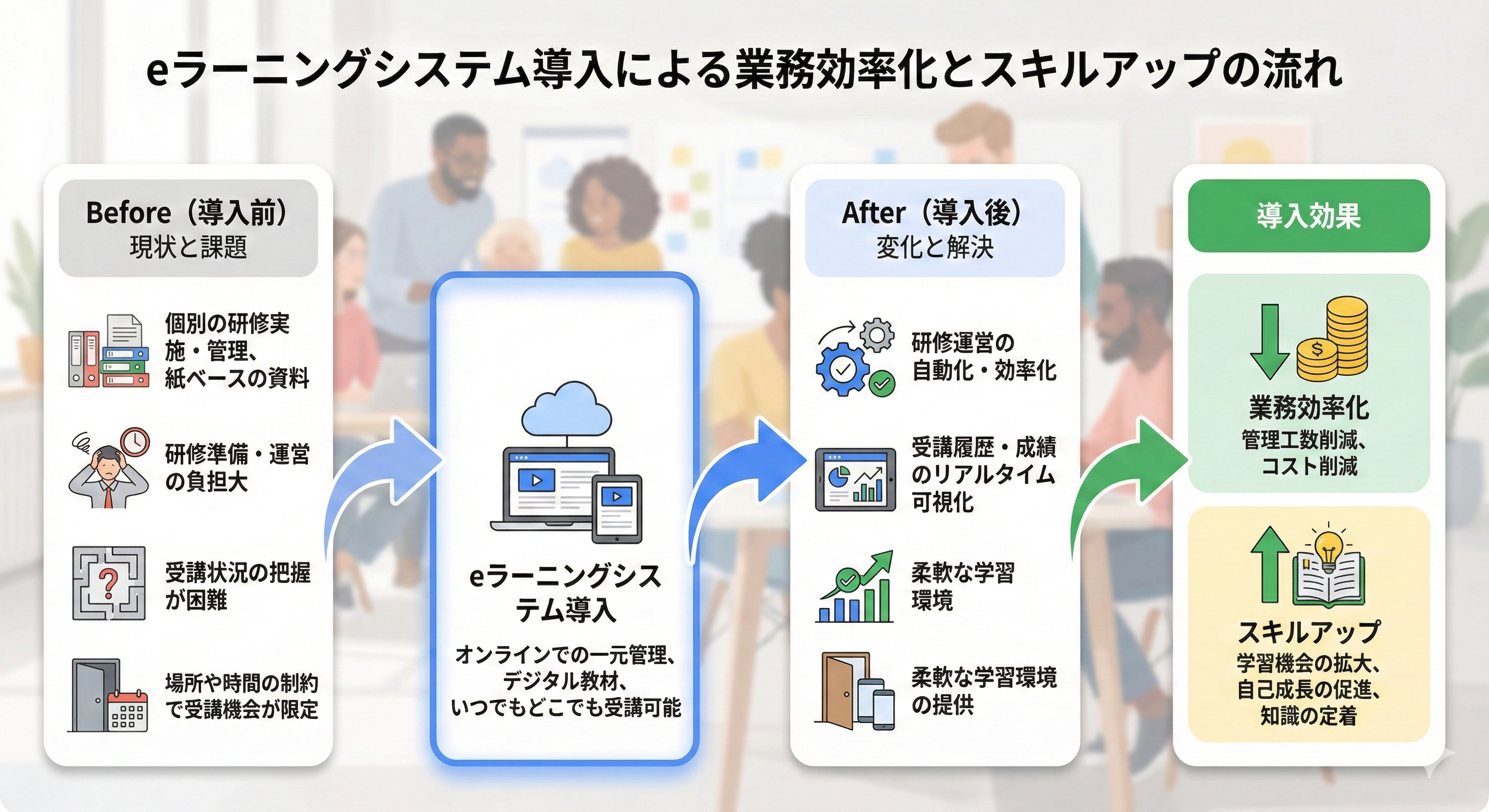 | 柔軟な学習環境 | 社員を会場に集める必要なく、いつでもどこでも同じ内容の研修を提供 |
