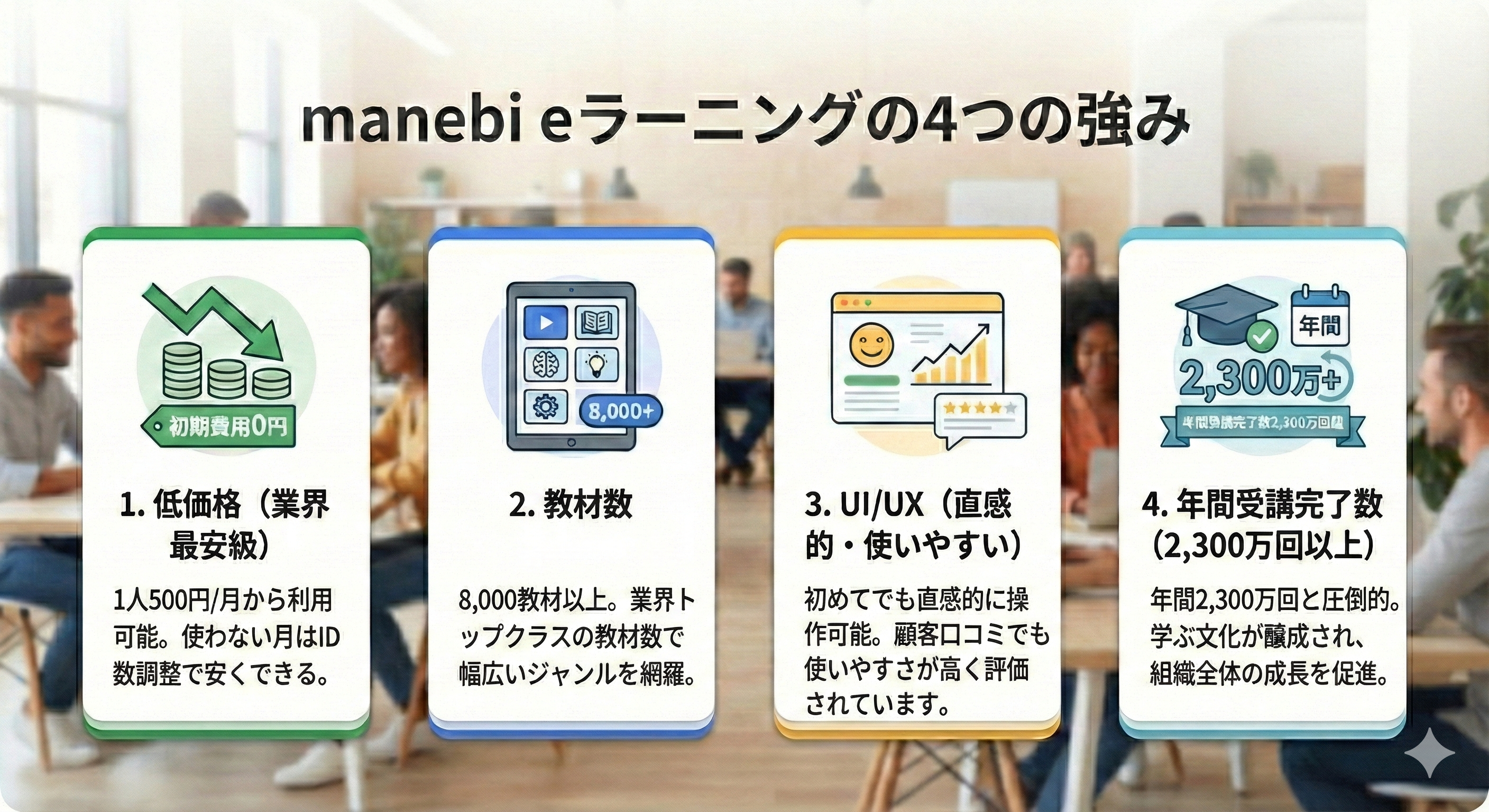 数あるシステムの中で、なぜ多くの成長企業がmanebi eラーニングを選ぶのでしょうか。その理由は、以下の4つの特長にあります。