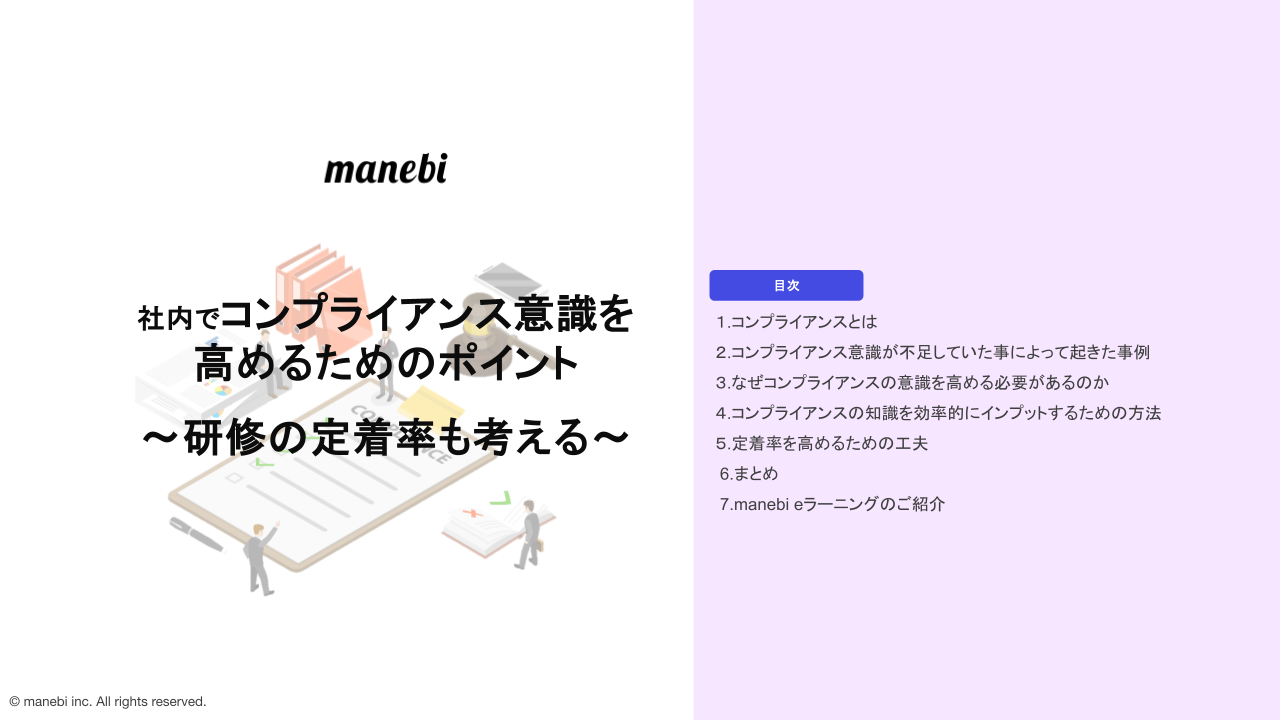 本記事では、eラーニングを構築する際の流れや必要な対応内容、費用感を徹底的に解説しました。manebiの eラーニングは、AIによる教材提案やSSO連携、大容量ストレージなどを備え、効率的で柔軟な研修運用をサポートします。自社に最適な学習環境づくりを目指す際には、ぜひ一度検討してみてはいかがでしょうか。