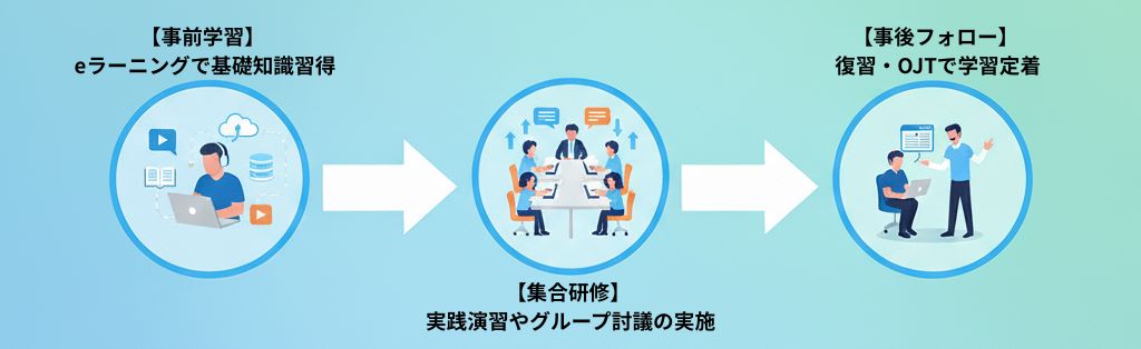 たとえば、事前にeラーニングで基礎知識を学ぶ → 研修で意見交換を行う → 現場で実践するという流れが一般的です。