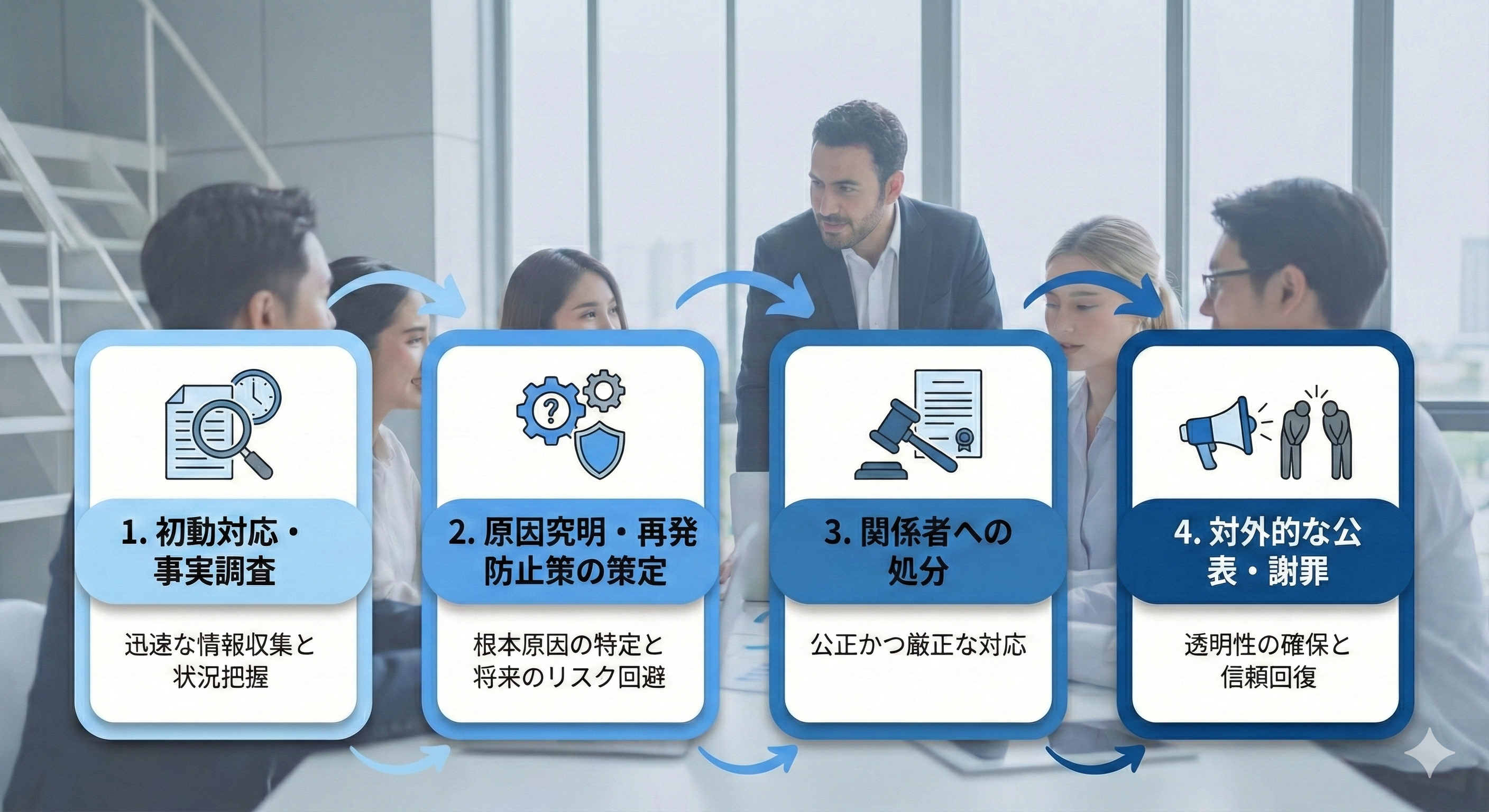 調査結果と処分が確定した段階で、プレスリリースや記者会見を通じて事実を公表し、謝罪を行います。現代において最もリスクが高いのがこのフェーズです。