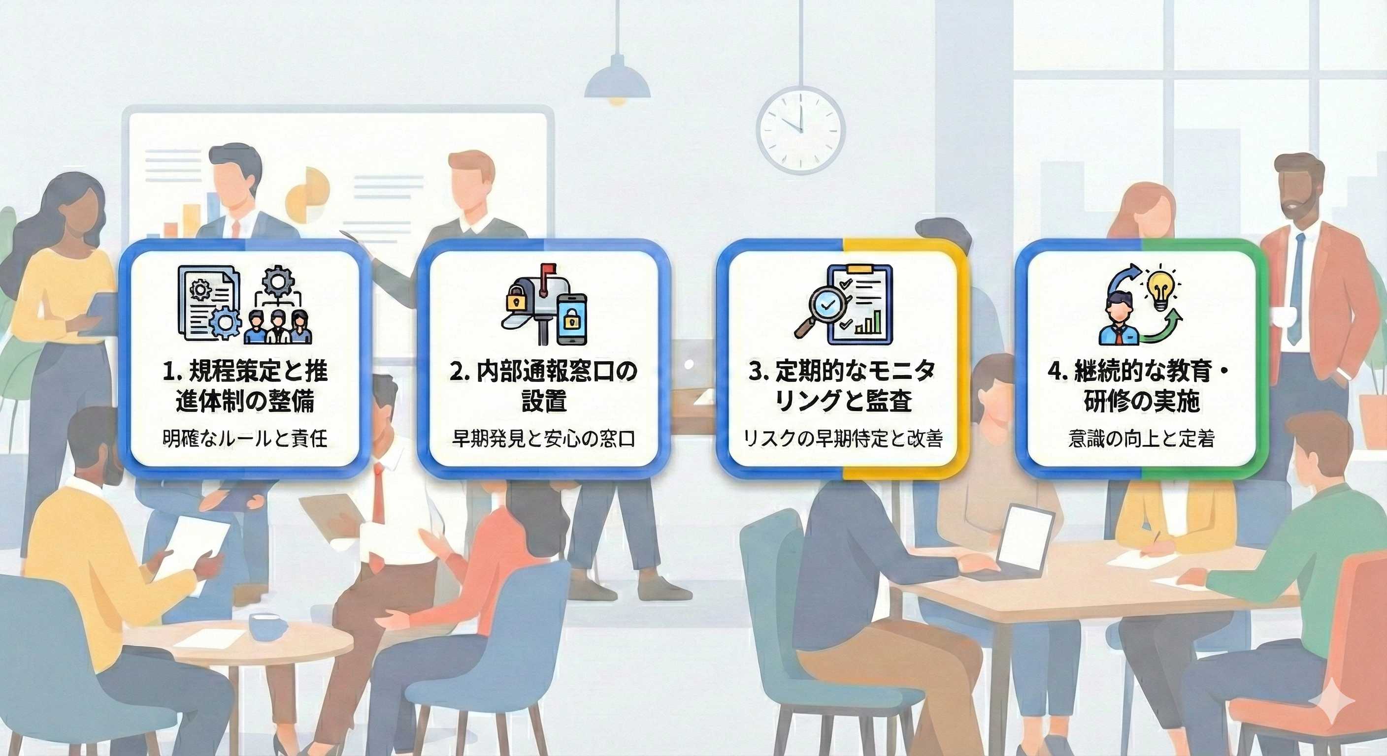 コンプライアンス違反を体系的に防ぐためには、単発の施策ではなく、以下の4つの対策をバランスよく実施することが重要です。組織のガバナンスを強化し、健全な運営を維持するための「4本柱」について解説します。