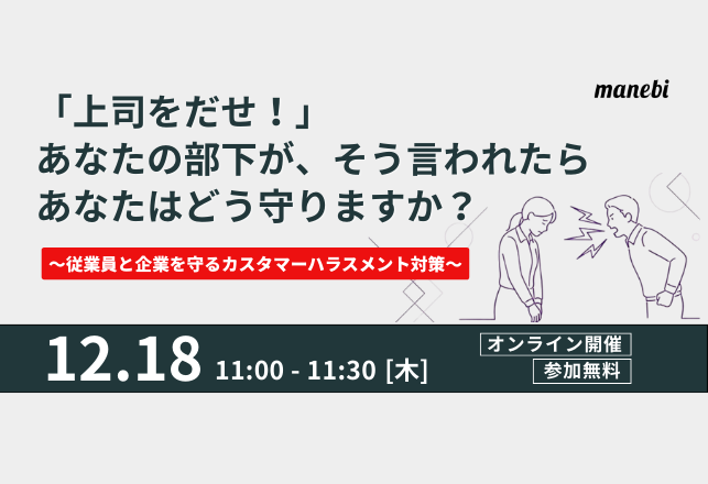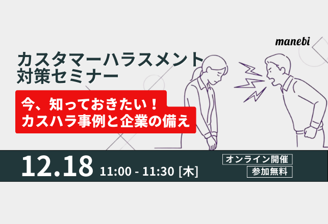 カスハラの基本や最新事例を紹介し、社員を守り組織を守るための実践的な対応策を学べるセミナーです。